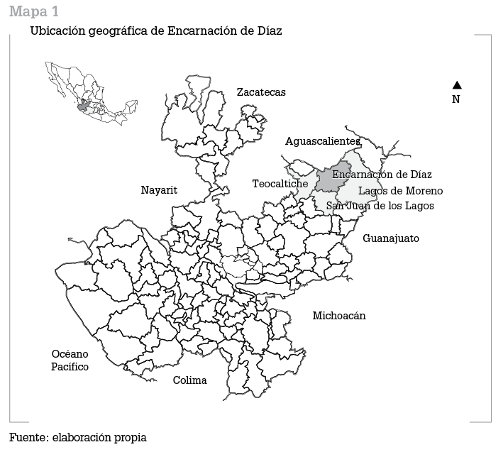 La población que hoy en día se llama Encarnación de Díaz (conocida coloquialmente como La Chona) es cabeza de un municipio del estado de Jalisco en la región de los Altos. Colinda al norte con el estado de Aguascalientes, al este y al noroeste con Lagos de Moreno, al oeste con Teocaltiche y al sur con San Juan de los Lagos. La villa de la La Encarnación fue erigida en 1760 gracias al esfuerzo de varios vecinos de la zona que donaron tierras para que se realizara la fundación. En 1778 se creó la parroquia de Nuestra Señora de La Encarnación para atender ranchos, haciendas y estancias que hasta entonces pertenecían a las jurisdicciones de Santa María de los Lagos, Teocaltiche, San Juan de los Lagos y Aguascalientes. En 1879 se le concedió el título de ciudad y se cambió su nombre por el de Encarnación de Díaz, en honor a Porfirio Díaz por sus triunfos durante la intervención francesa (ver mapa 1).