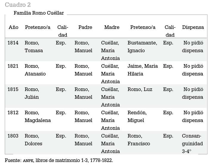 En 1801 José Anselmo Romo expresó que le sería difícil encontrar una pareja que no fuera su pariente, a menos que la buscara entre las mujeres de menor calidad, a lo cual su padre se opondría.23 No obstante, su padre, Miguel Romo, logró encontrar consorte para seis de sus nueve hijos entre personas designadas como “don” o “doña” con quienes no había impedimento de parentesco (ver cuadro 1).