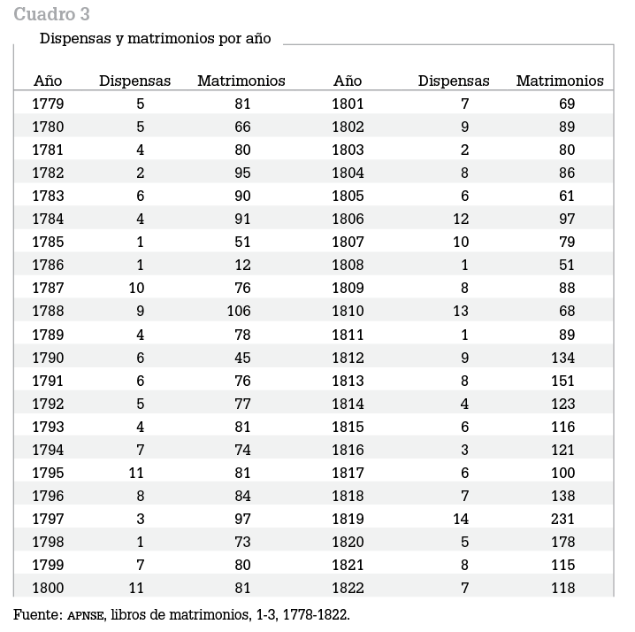En la parroquia de La Encarnación, durante el periodo de 1778 a 1822, se pidieron un total de 300 dispensas (7.37% del total de las nupcias) por algún impedimento del matrimonio. En el cuadro 3 se observa el número de dispensas y matrimonios que se celebraron anualmente; en general las dispensas se mantienen en menos de diez por anualidad. Los años en que se pidieron más están relacionados con una crisis epidémica que provocó la postergación de matrimonios y una posterior recuperación. Por ejemplo, durante “el año del hambre” (1785-1786) sólo se tramitó una dispensa; de igual forma, el número de nupcias descendió por la alta mortalidad del periodo, pero en 1787 comenzó la recuperación de los matrimonios. De igual forma, el aumento de dispensas de 1806 podría explicarse por los matrimonios postergados durante la epidemia de sarampión de 1804. El año con mayor número de dispensas y matrimonios fue 1819, fenómeno que se explica por la sobremortalidad acaecida de 1814 a 1817, provocada por una epidemia de fiebres y viruela en 1815.