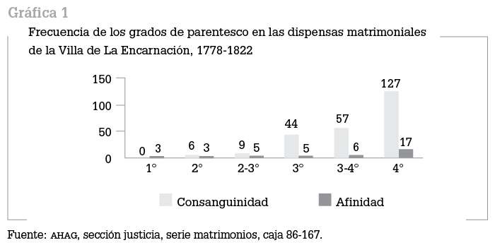 Más de 90% de las peticiones de dispensa de la parroquia de La Encarnación (1778-1822) fueron por impedimento de parentesco. 274 dispensas se otorgaron por esa razón: 39 de ellas por parentesco de afinidad y 243 por consanguinidad.50 En la gráfica 1 se observa que el grado de parentesco más frecuente por el que se pidió dispensa fue el cuarto, es decir los matrimonios entre primos terceros fueron los más usuales; le siguieron el tercero, con cuarto y tercer grado. Esto parece indicar que en los matrimonios entre parientes mediaba algún tipo de estrategia, ya que no todos los miembros de la familia eran posibles consortes; quizá se elegían a los miembros más alejados de la familia para volver a estrechar los lazos familiares o podría ser que los matrimonios en grados cercanos, como primos hermanos, eran mal vistos.