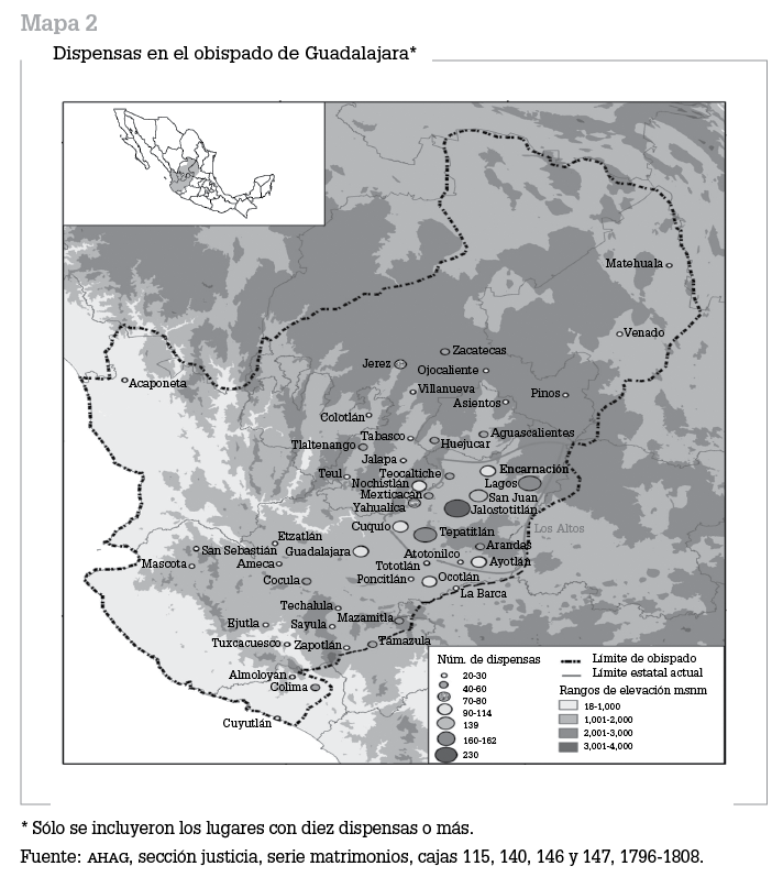 Se localizó en el Archivo de la Arquidiócesis de Guadalajara un inventario que contiene la relación de todas las dispensas que se solicitaron entre 1796 y 1808.54 En dicho periodo se pidieron un total de 3 456 dispensas. En el mapa 2 puede observarse que fue efectivamente en la región de los Altos de Jalisco donde con mayor frecuencia tuvo lugar este tipo de enlaces (en total 1 251 solicitudes). Las dispensas de los Altos de Jalisco casi triplicaron las solicitadas desde el actual estado de Zacatecas, por ejemplo (490). En Jalostotitlán se pidieron 230 dispensas, le siguen Tepatitlán con 162, Lagos con 160, San Juan con 139, La Encarnación con 92, Ayo el Chico y Cuquío con 90, Yahualica con 88, Arandas con 69, Teocaltiche con 53, Mexticacán con 43 y Atotonilco con 35.