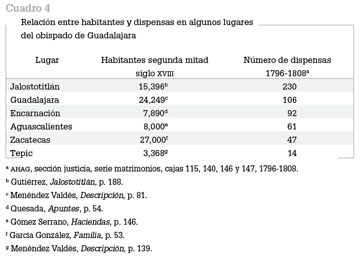 Para distinguir si hubo relación entre el número de habitantes y la cantidad de dispensas solicitadas, se consultaron las cifras de población de algunas localidades: Aguascalientes, La Encarnación, Guadalajara, Jalostotitlán, Tepic y Zacatecas. En el cuadro 4 puede observarse que Zacatecas tiene una mayor cantidad de habitantes, le sigue Guadalajara, en tercer lugar aparece Jalostotitlán, y después Aguascalientes, La Encarnación y Tepic. Si se le da el orden a la tabla de acuerdo con la cantidad de dispensas, en los primeros lugares están Tepatitlán, Guadalajara y La Encarnación. Por lo tanto, no siempre hay concordancia entre el número de habitantes y el número de dispensas. La Encarnación es el penúltimo lugar por número de habitantes y el tercero según las dispensas; y Zacatecas, que es el primero en población, resultó ser el penúltimo con relación a las dispensas; Jalostotitlán y Guadalajara invierten sus posiciones y sólo Tepic permanece en el mismo sitio. La Encarnación, de hecho, es el lugar que presenta la mayor cantidad de dispensas en relación con su población.