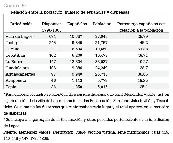 Los siguientes cuatro lugares, de acuerdo con el número de dispensas, los ocupan Juchipila, Cuquío, Tepatitlán y La Barca que tienen todos un alto porcentaje de españoles. Sin embargo, Aguascalientes tiene un porcentaje mayor de españoles en comparación con la villa de Lagos y la cantidad de dispensas es mucho menor. La práctica de la endogamia no estuvo por lo tanto determinada por el alto número de españoles en una jurisdicción dada, ni tuvo relación con el número de habitantes de los asentamientos, sino que corresponde a una estrategia matrimonial particular que se desarrolló sólo en ciertos lugares.