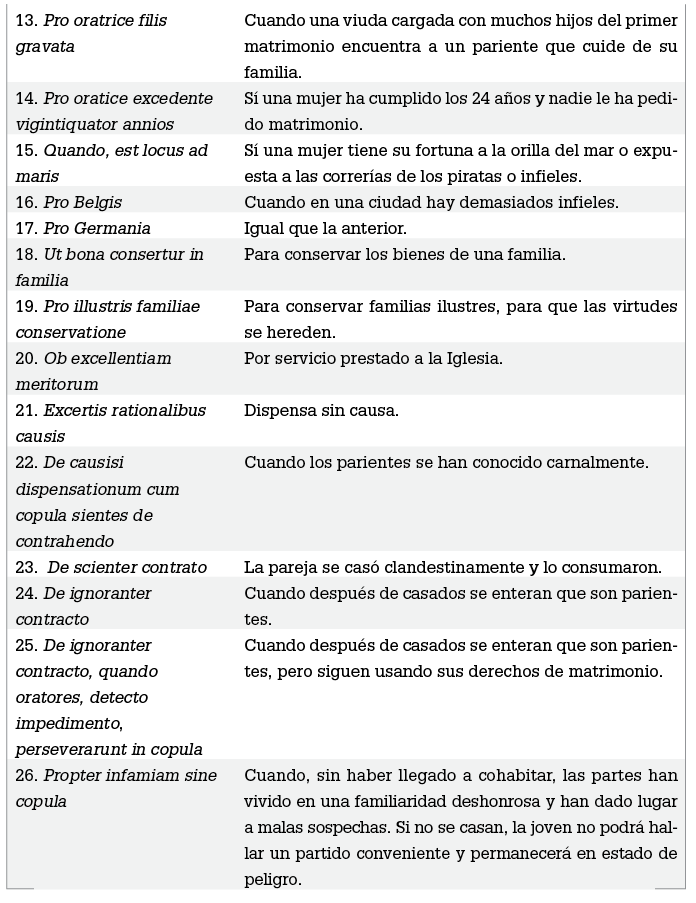 Según el Derecho Canónico, las dispensas se pueden pedir en dos formas: de pobreza u ordinaria. La forma de pobreza, como su nombre lo indica, se concede de manera gratuita o con menor costo a las personas pobres, quienes para poder recurrir a ella deben comprobar que sólo se mantienen con su trabajo personal. La forma ordinaria se concede si se cumple con las causas canónicas, que son veintiséis razones por las que el impedimento de parentesco puede obtener dispensa; todas hacen referencia a la mujer y tienen que ver con el número de habitantes de su lugar de residencia, con su dote, su edad y algunas situaciones de riesgo (ver cuadro 6 al final del texto).