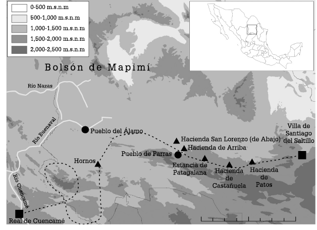 El territorio parroquial de Parras en el siglo xviii abarcaba de este a oeste desde las colindancias con la parroquia de Santiago del Saltillo, que pertenecía al obispado de Linares (Nuevo León) hasta el Río Buenaval, en la jurisdicción del Real de Cuencamé, abarcando la Laguna; en total eran unas 70 u 80 leguas (alrededor de 300 kilómetros cuadrados), de norte a sur desde los límites del Bolsón de Mapimí hasta el Real de Mazapil; es decir, casi todo el sur del actual estado de Coahuila (Río, 1975, p. 1112; Corona, 2001, pp. 39-57). Aunque era inmenso el territorio, en la práctica solamente se administraban los sacramentos y el “pasto espiritual”3 a los habitantes del pueblo de Parras y algunos centros de población que formaban una línea horizontal de oriente a poniente en relación con el pueblo de Parras que incluían algunos ranchos, haciendas y estancias. Gran número de indios de las zonas más alejadas al norte y al poniente se mantuvieron en la clandestinidad y eran considerados infieles o bárbaros,