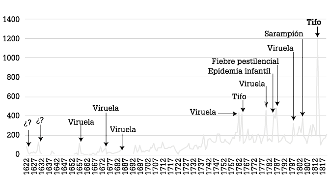 Luego de las epidemias del siglo xvi y la primera mitad del xvii vino un periodo de relativa calma y recuperación demográfica que se prolongó un siglo aproximadamente, aunque las crónicas de la época y los registros parroquiales denotan algunas epidemias menores. En 1622 se dio en Parras una de relativa importancia, aunque desapareció pronto según lo consideró Francisco Javier Alegre, el historiador jesuita del siglo xviii (Churruca, 1989, p. 111). En los registros de entierros, que empiezan a partir de ese año, también quedó consignada dicha epidemia, aunque de forma muy tenue. Las partidas de entierros del siglo xvii también registran otras cuatro sobremortalidades en 1630, 1657, 1673 y 1684, estas últimas tres epidemias de viruela, según lo consignan las partidas de entierros (Churruca, 1994, p. 57). Esas epidemias no quedaron consideradas en el listado de Elsa Malvido y Enrique Florescano (1982, pp. 171-176), por lo que pudo tratarse de endemias4 o epidemias que no fueron consgnadas por lo temprano de su registro.
