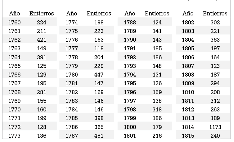 Fuente: Churruca, 1994, p. 65. ahmm, Libros de entierros de 1693 a 1820.