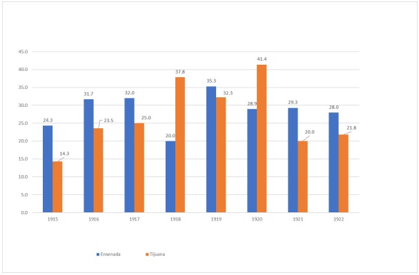 Este testimonio nos ofrece una perspectiva cualitativa que contrasta con los datos cuantitativos presentados en la Tabla 2. Como se puede observar en dicha tabla, los datos absolutos reflejan la cantidad de fallecimientos por año en Ensenada y Tijuana, así como el porcentaje de cada uno respecto del total. Aunque es probable que haya un subregistro, estos números nos proporcionan una idea general de lo que sucedía en estos poblados importantes.