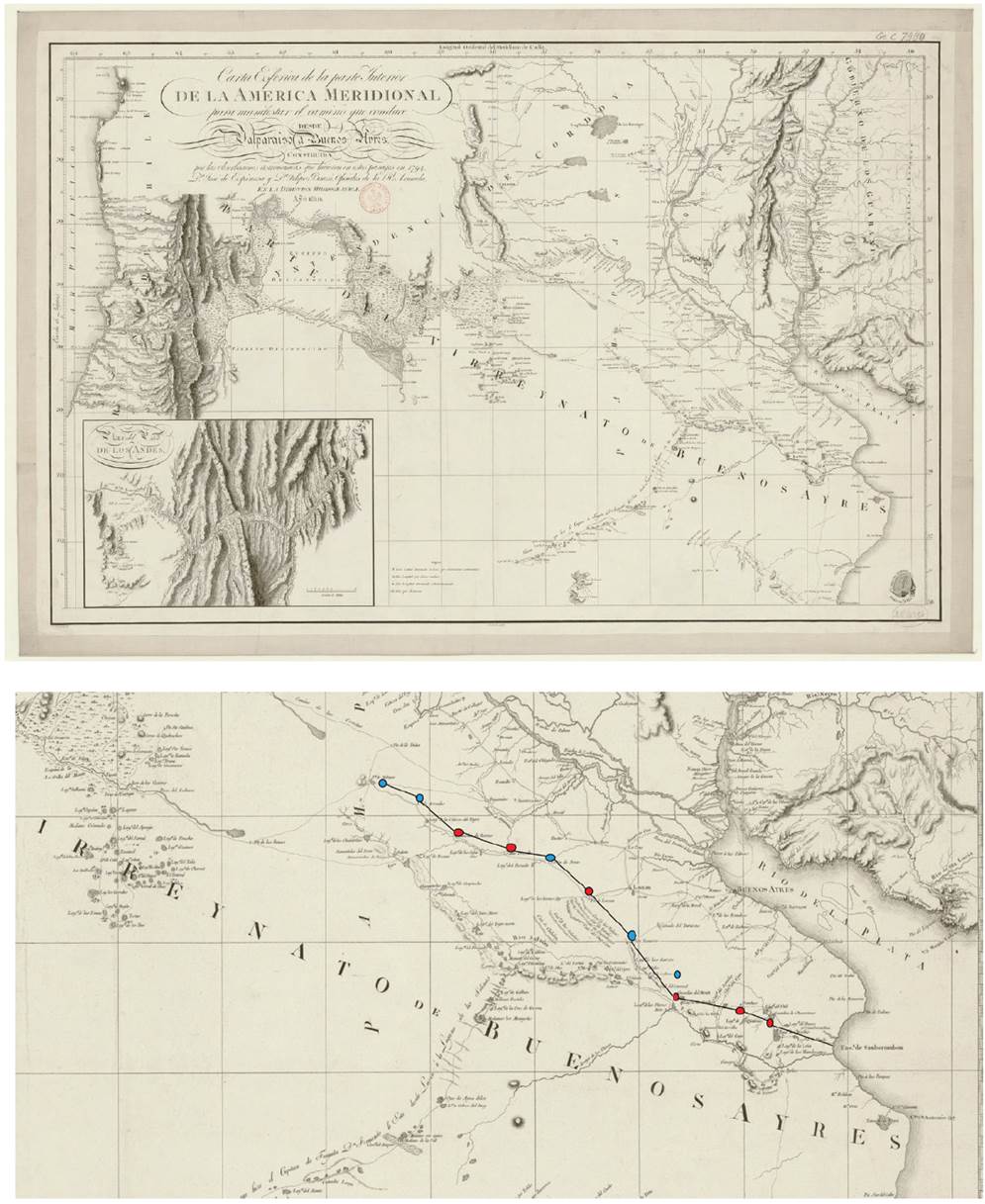Fuente: Extracto de la Carta esférica de la parte interior de la America meridional para manifestar il camino… desde Valparaíso a Buenos Aires, construida por les observaciones... que hicieron... en 1791 / D. Jose de Espinosa / y D. Felipe Bauzá... 1810.