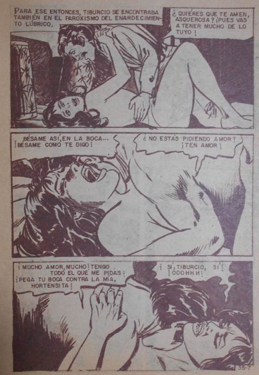 Con relación al primero, dado que este tipo de publicaciones debían obtener autorización de las secretarías de Educación Pública y de Gobernación para poder circular, los editores tendieron a cuidar el lenguaje utilizado, especialmente pensando en la preservación de la moral y las buenas costumbres.12 Así, en esta historieta los términos eróticos utilizados refieren descripciones corporales del cuerpo femenino: senos, caderas y piernas. Por ejemplo, en la historia sobre Alma Rosa, ella es descrita así: “la curvatura lechosa de sus grandes senos se estremecía, asomándose por el escotado borde de la blusa transparente”. Ella le ayudaba al sacerdote y “era un espectáculo ver aquella sinfonía de muslos y encajes cuando Alma Rosa trepaba por la escalera del campanario para llamar a misa”. El placer visual de Rosalío, el admirador, es así narrado: “Mientras ella lavaba junto al rio, era inevitable ver los muslos que tenían toda la magia de una belleza erótica y sensual…extremidades que invitaban al beso y al mordisco”; y “aquellos pechos palpitantes que le subían y bajaban al compás de la respiración”.13