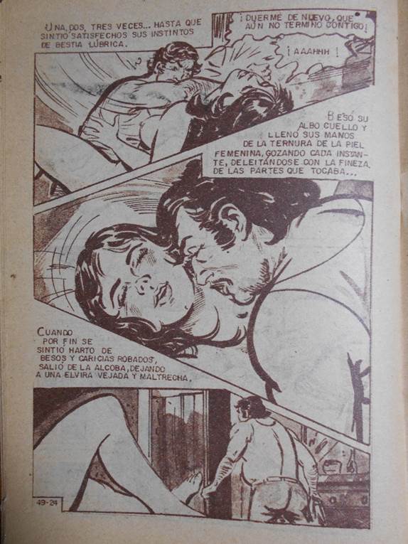 Esta publicación de treinta y dos páginas y de circulación semanal, además de tener un contenido claramente erótico y estar dirigida a un hipotético público masculino, mantenía como escena central una violación sexual. Estas narraciones tenían como objetivo erotizar al lector recurriendo a un acto de extrema violencia donde uno o varios hombres abusaban sexualmente de una mujer. De los diez ejemplares que ubicamos, todos contienen escenas de violencia contra las mujeres y seis tienen una violación como escena central. Estas son historias donde los hombres siempre son figuras dominantes que ejercen violencia, controlan la sexualidad de las mujeres y, en ocasiones, actúan en contextos de ilegalidad. En consecuencia, esta historieta nos acerca a un conjunto de símbolos que el mexicano de las clases populares consideraba erótico, ya que la lectura de esta publicación dependía directamente de la capacidad que el relato tuviera de excitarlo sexualmente, como si esa fuese la recompensa por comprar la historieta y leerla. Para analizar los contenidos de este cómic retomamos dos categorías analíticas: Rape Myths y melodrama.